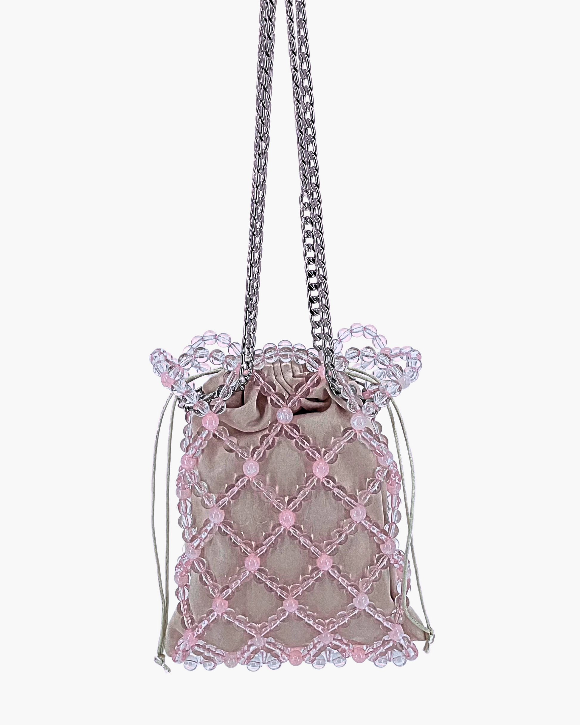 Le sac CU(N)TIE est composé de plus de 450 perles en acrylique et d'une chaîne en acier inoxydable de 130 cm qui permet de porter le sac en bandoulière ou à la main ⟢.