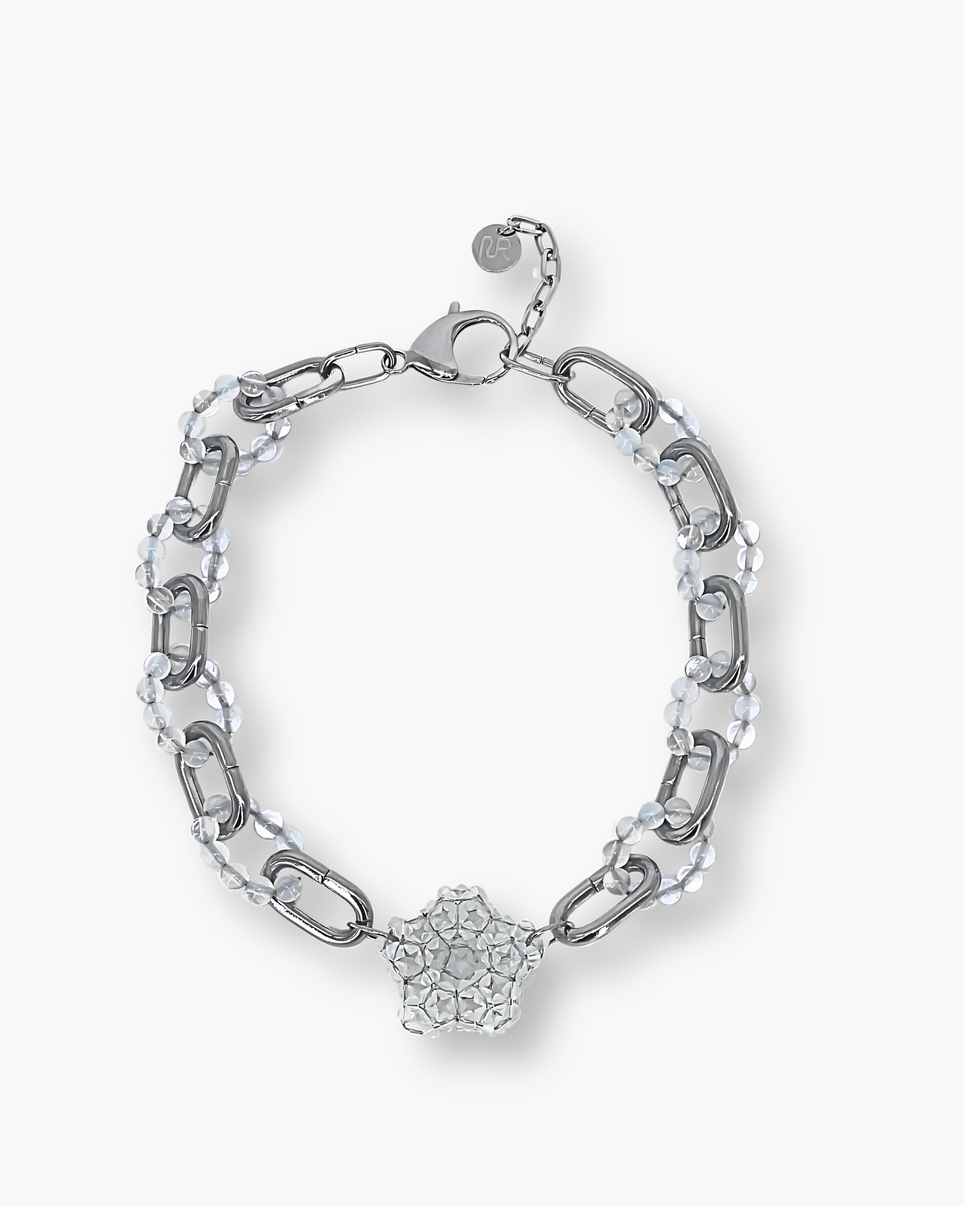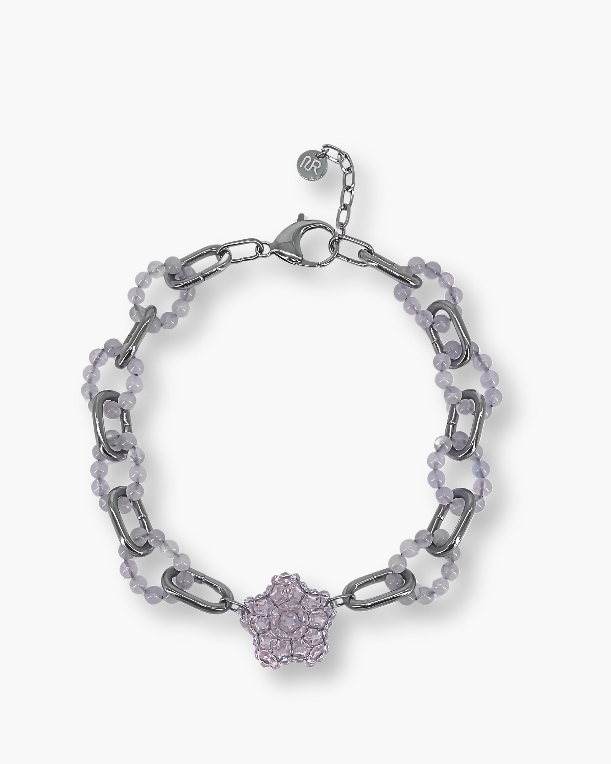 Il est composé de plus de 205 perles. La pièce centrale est composée de cristaux enfilés à la main et les maillons sont en quartz rose ou en pierre de lune ⟢
